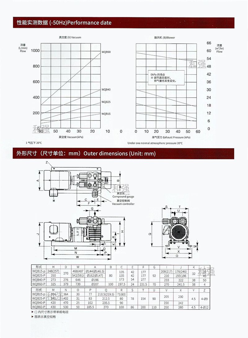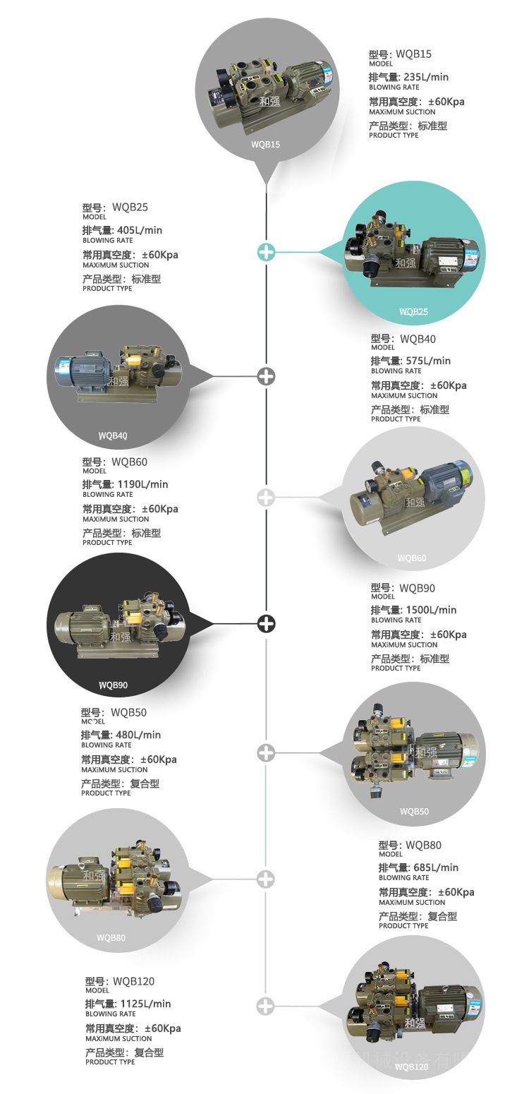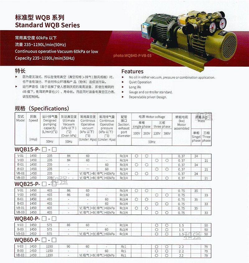 产品优势:1、因为是无油式,所以在使用真空、排气时,也不含有油分,不会对作业环境和产品造成油污染。2、运行声音低(由于去掉了使人感到厌烦的高周波音,即使在相同的分贝值下,刺耳声音也很少)、寿命长。而且同时装备有真空压力表、调压控制阀。3、而复合泵由于是双气缸,因此具有双功能(真空泵、鼓风机并列),可以同时作为真空度为60kpa的真空源和排气压力60kpa的空气源来同时使用。4、与之前的真空泵相比较,该泵具有体积小,重量轻,同时操作简便。YUXU宇旭WQB15系列每小时15立方:WQB15-P-V-01 WQB15-P-V-03 WQB15-P-B-01 WQB15-P-B-03 WQB15-P-VB-01 WQB15-P-VB-03